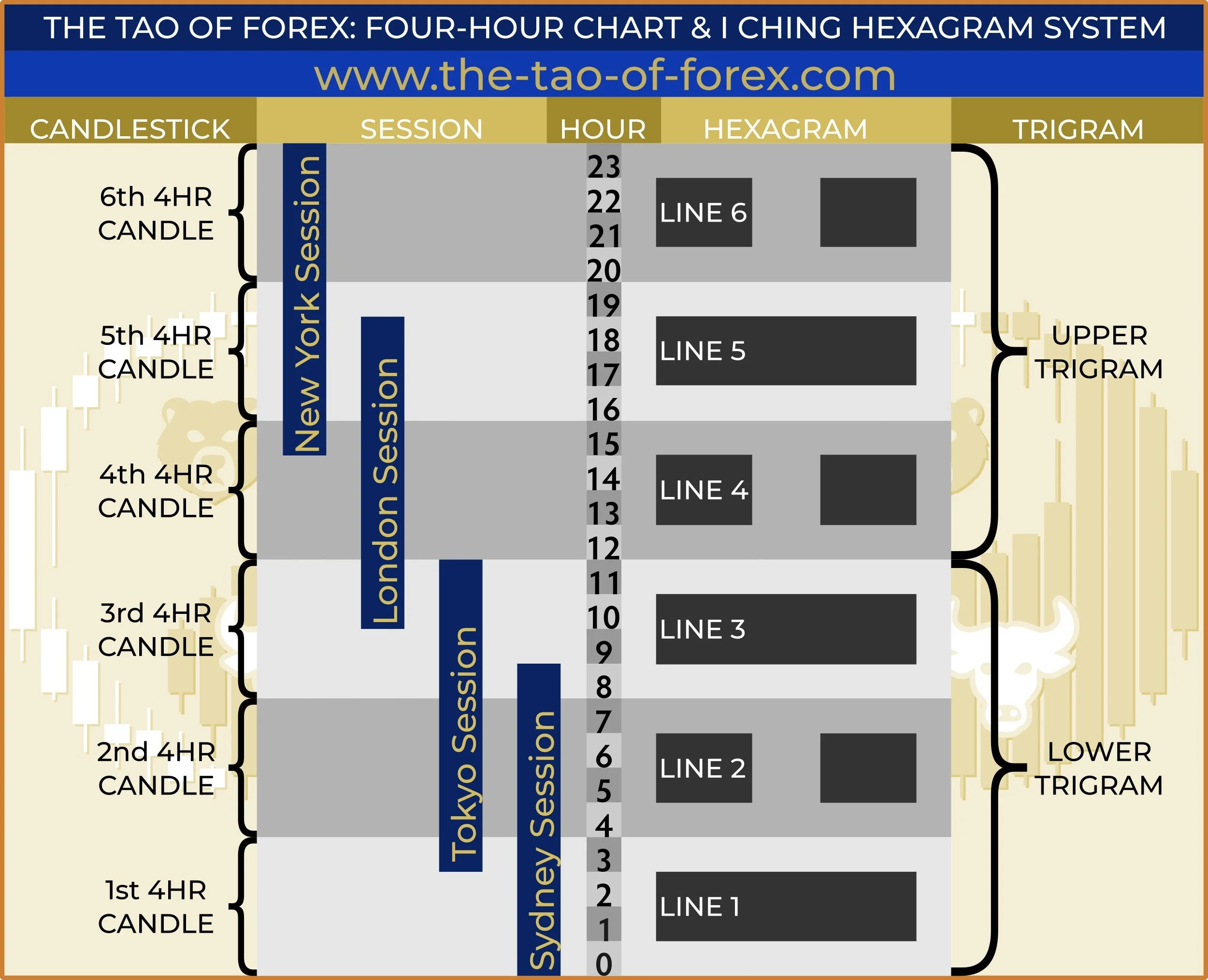 Each line of the hexagram can represent a 4-hour period, and the yin/yang nature of the lines (broken or unbroken) can be used to reflect the market's behavior during that time. Here's how each line might symbolize and correspond to a 4-hour period on the chart: